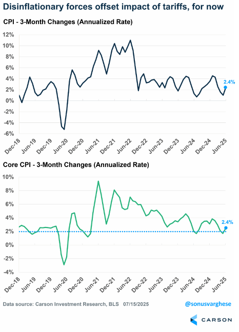 April and May were too early for any tariff impact to show up. Keep in mind that we got big whipsaws in tariff policy, including massive tariffs on Chinese goods pulled back in May. Still, the average effective tariff rate is about 10%-points higher than it was at the beginning of the year, and the proof is in the pudding that is federal government finances—we have in fact seen a big jump in import duties collected by the federal government. So, who’s paying this? As I’ve noted in the past, import prices haven’t fallen and that indicates that foreign exporters are not the ones paying these tariffs. It’s US businesses, via a hit to margins, or consumers, via higher prices. The question is when it would show up in the data. The short answer is that it’s started showing up in June inflation data, but at the same time, there have also been some disinflationary forces countering the inflationary impact of tariffs.
