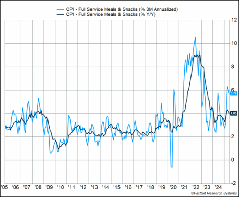 I like to keep an eye on CPI of “full services meals and snacks,” i.e. seated restaurants, to gauge underlying inflationary pressure. That’s because it combines several drivers of inflation including: