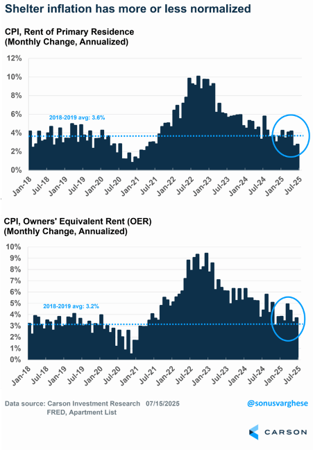 The good news is that if you look at the private market data, there may be more shelter disinflation to come. Private rental inflation data form Apartment Lists still shows nationwide rents declining 0.6% year over year, the 25th straight month of declines, which means rents should continue to ease.
