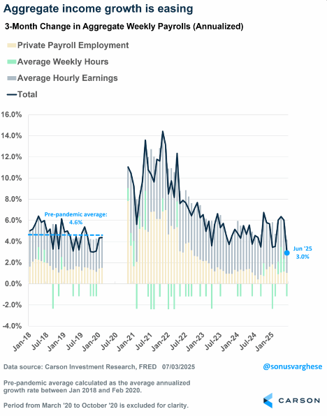 Aggregate income growth rose just 3% annualized over the past three months. Think of that as the pace of nominal GDP, and if you shave off about 2% for inflation, that means real GDP growth is clocking in around 1%. That’s not recessionary but it is really soft, and well below the near 3% pace we saw in 2023-2024. Meanwhile, Fed policy rates are around 4.4%.