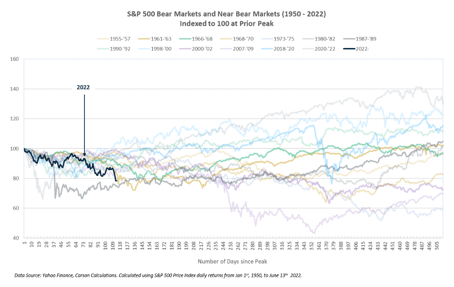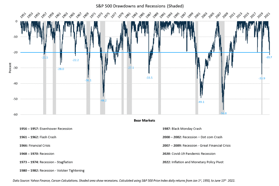 Fueled by inflation readings that have remained stubbornly elevated, the stock market, measured as the S&P 500 Index, entered bear market territory at market close on June 13, 2022. A bear market represents a decline in equity values by more than 20%.