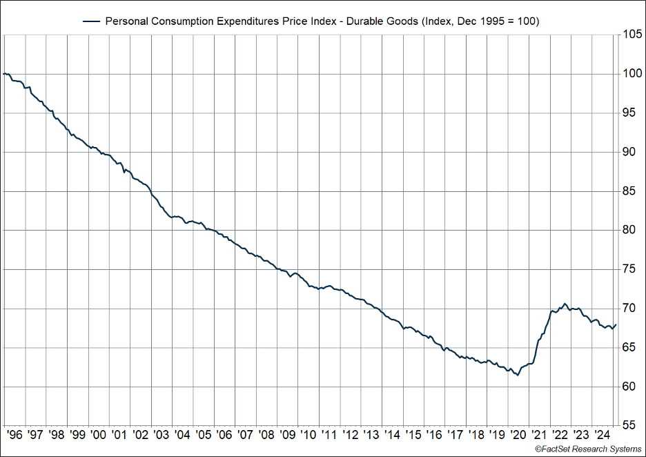 It also gets to the point that these tariffs have several incompatible goals. On one hand, the goal is to bring back manufacturing to the US. Let’s be clear, this would happen by import substitution, i.e. making foreign goods much more expensive and forcing Americans to buy slightly less expensive US goods (but still more expensive than current prices). Keep in mind that this has major implications for household consumption, especially durable goods (like cars, furniture, appliances, TVs, etc.). The last 30 years, following NAFTA and China’s entry into the WTO in 1999, saw a steady pullback in durable goods prices (the chart shows the personal consumption expenditures index for durable goods). Covid broke that streak, as supply chains cracked, but over the last two years, it was looking like the downtrend in prices resumed. But now, the goal is to willfully break those same supply chains, which means we could be at the end of an era of durable goods deflation.