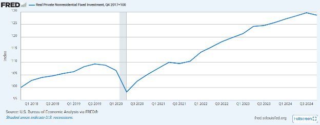 Real private nonresidential investment, i.e. business investment, was already slowing in Q4 2024 before this shock. Companies sitting back without making investments is going to be a bigger drag on GDP going forward. Now, we did have a trade war in 2018 – 2019 and didn’t see a big collapse in business investment but that time had two things going for it: 1) a huge corporate tax cut, and 2) a Federal Reserve (Fed) that started to reverse tight policy. That’s not the case today.