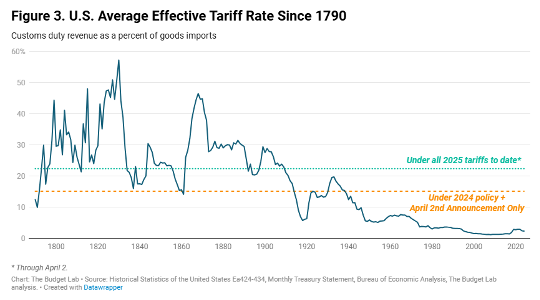 The Budget Lab at Yale calculates that the US average tariff rate will rise to 22.5% if these tariffs are implemented, the highest since 1909, even higher than the Smoot-Hawley tariffs signed into law by President Hoover in 1930.